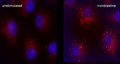 The majority of LC3 was diffusely localized in unstimulated (A) COS7 cells, whereas punctuated signals of LC3 increase after induction of autophagy by vinblastine-stimulation for 2 hours (B). Cells were fixed in paraformaldehyd, followed by methanol. Permeabilization was performed with 0.3% Triton X-100 and endogenous LC3 subsequently detected by MAb 5F10 (Images by courtesy of I. Ciechomska and A. Tolkovsky, University of Cambridge, UK).